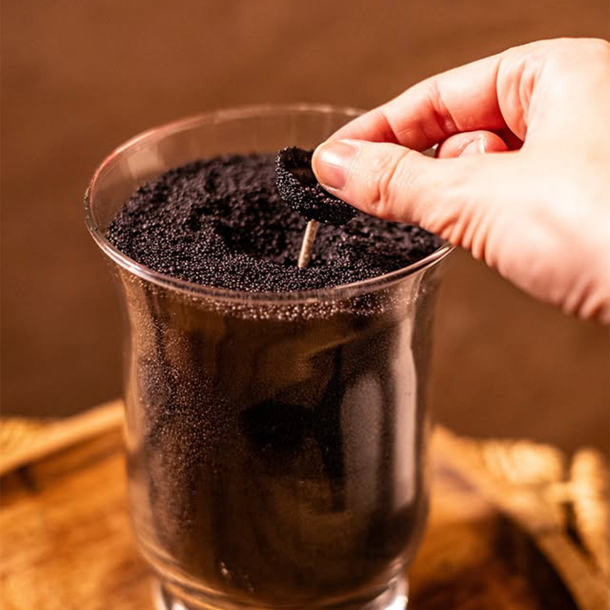 Tag en væge (medfølger) og placer den midt i perlevoksen. Sørg for, at den står lige og kun stikker ca. 1 cm op.