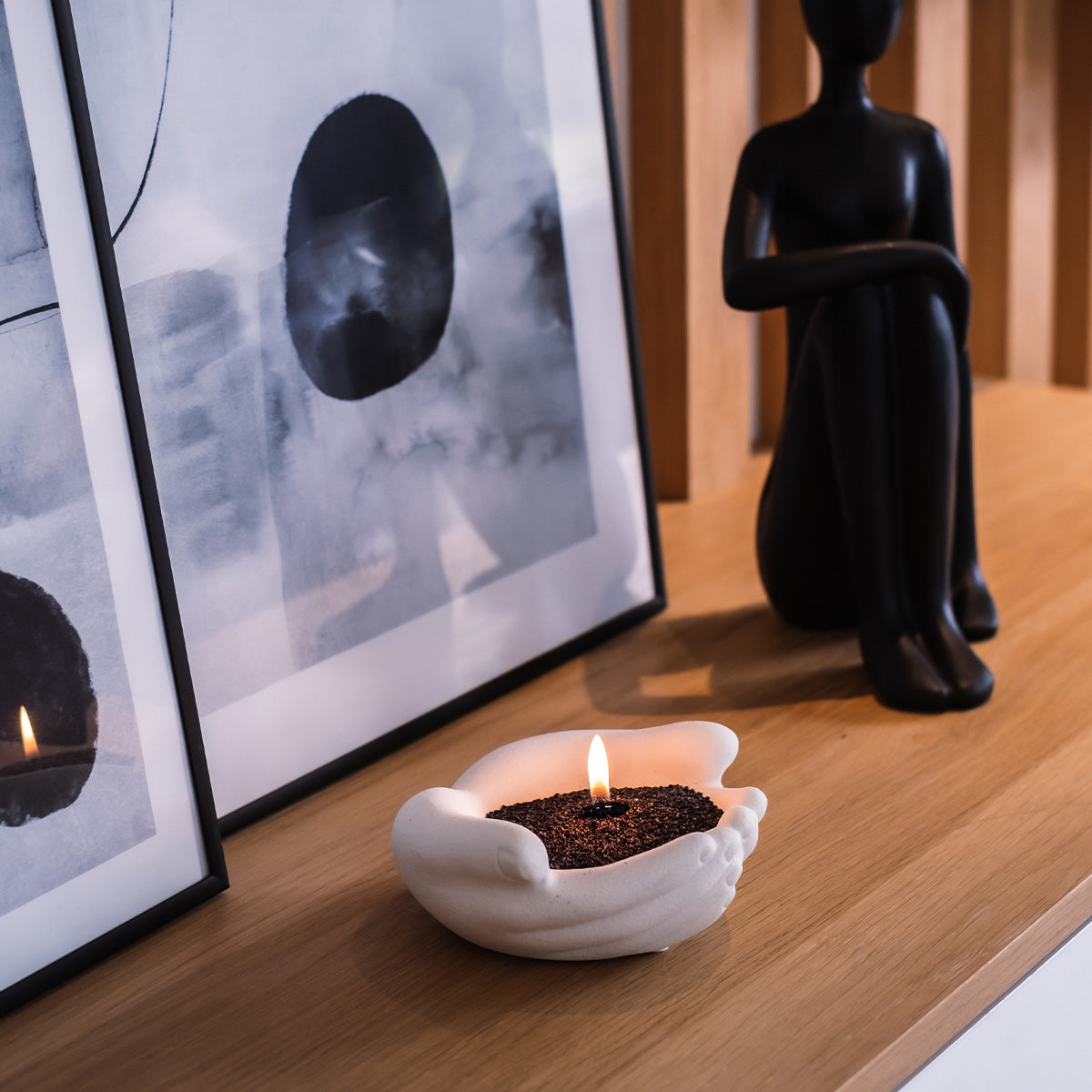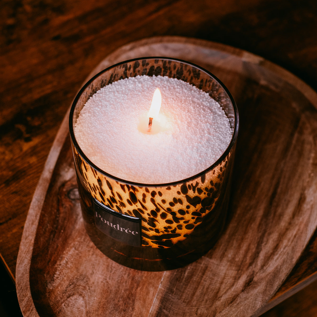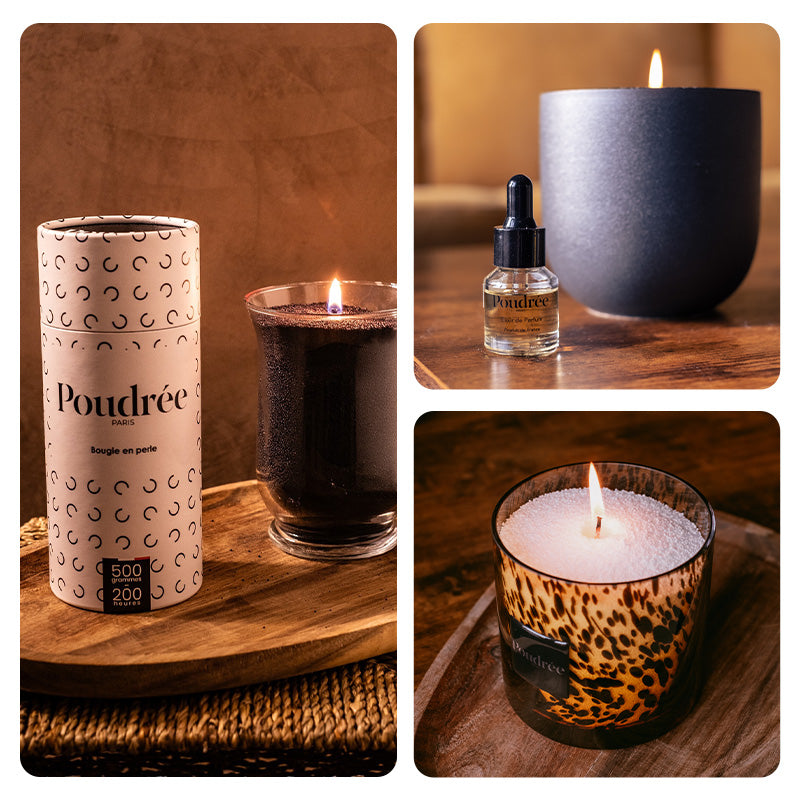 Hvis din Poudrée-bougie vælter, vil de små voksperler falde ud og automatisk kvæle flammen.